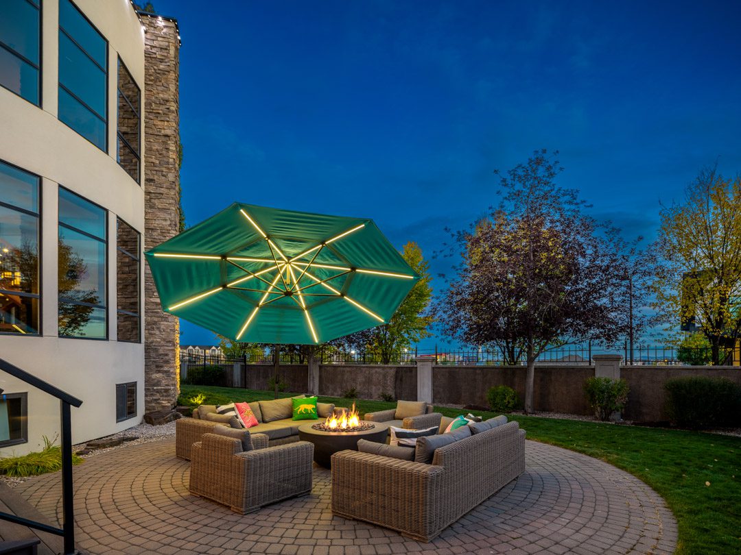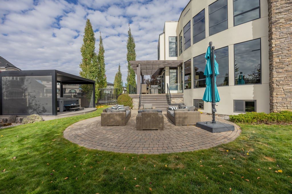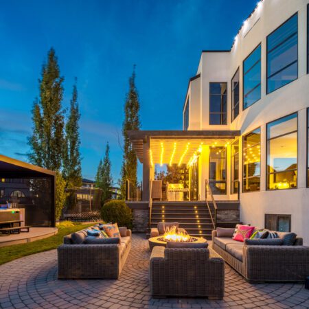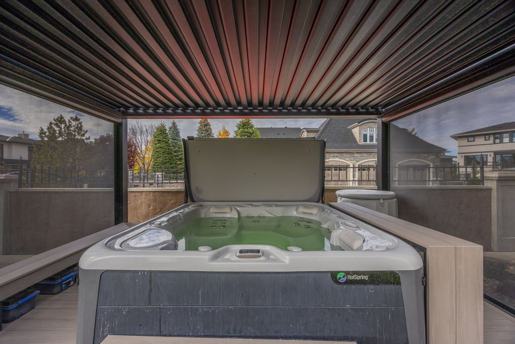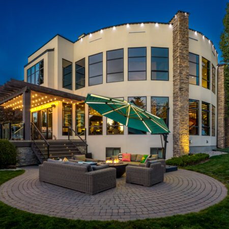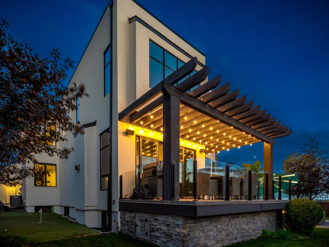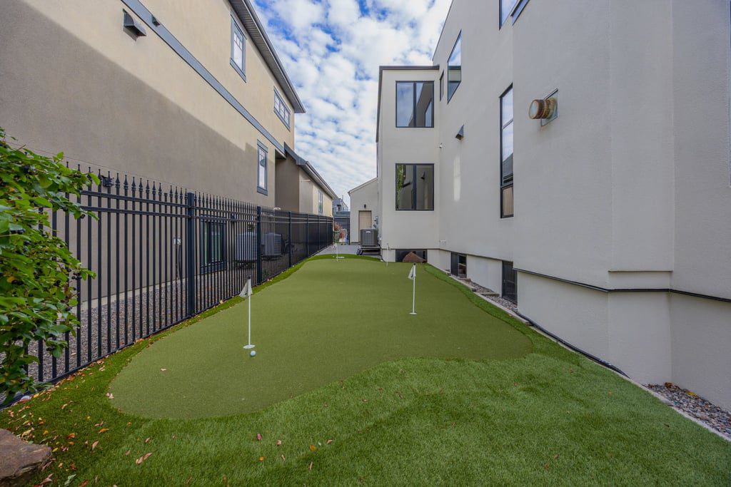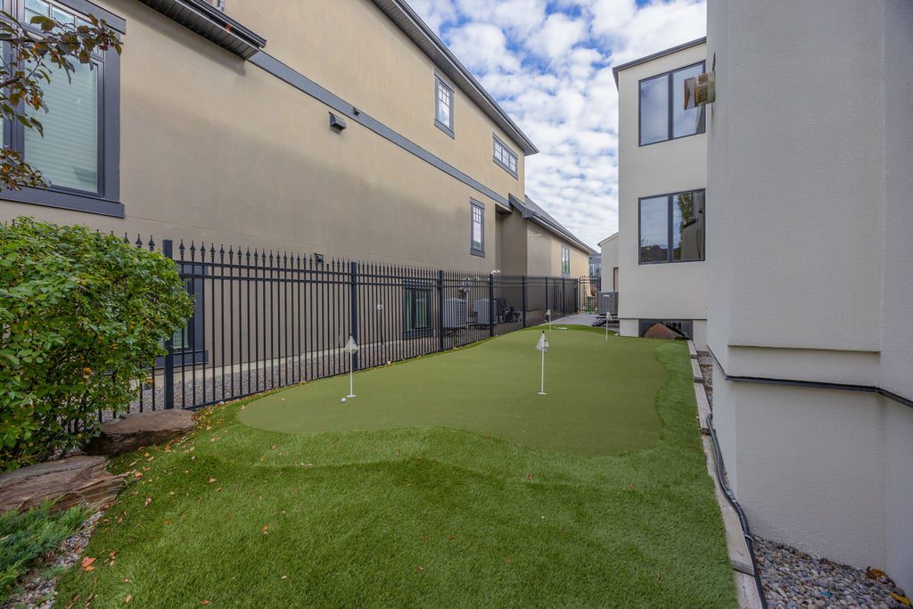 Outside, the property transforms into a private retreat designed for year-round enjoyment. Highlights include multiple patio spaces, a firepit, a covered hot tub area, an outdoor putting green, and an elevated deck with clear glass railing and BBQ—a seamless extension of the home’s indoor living spaces.