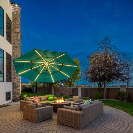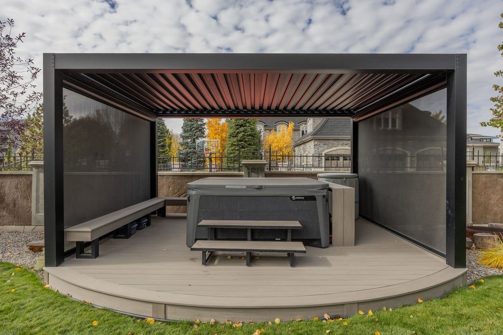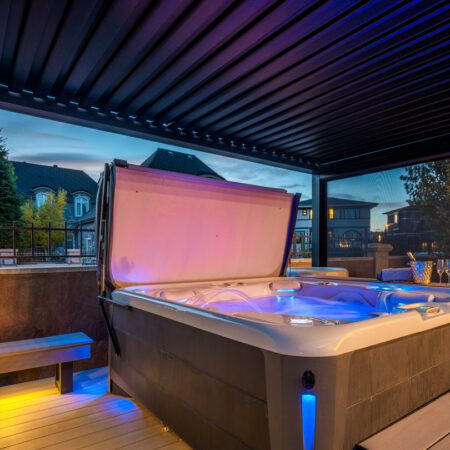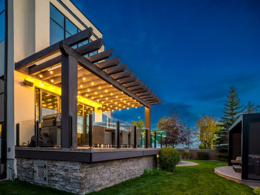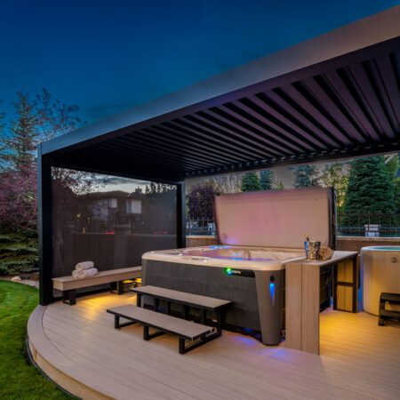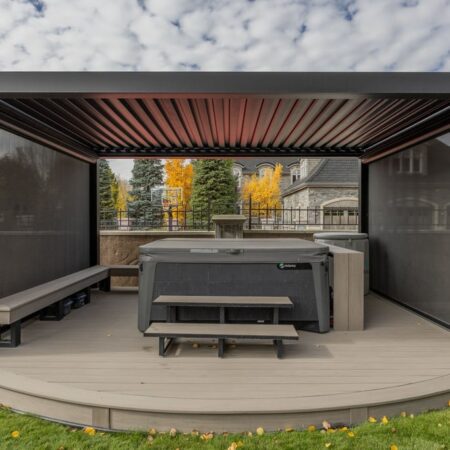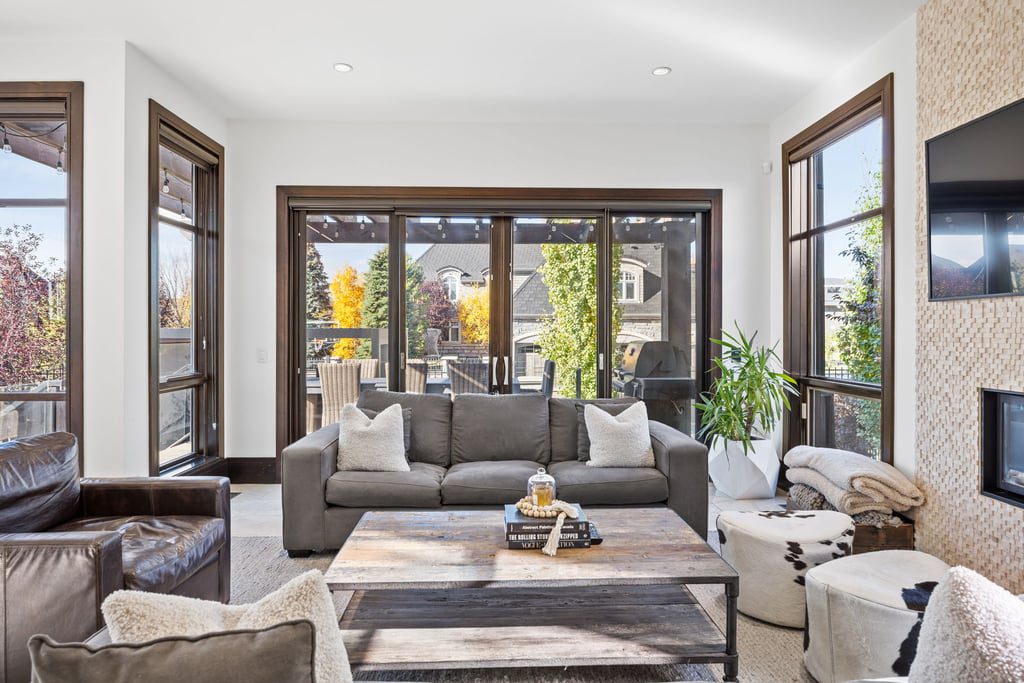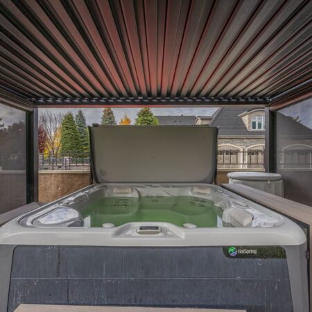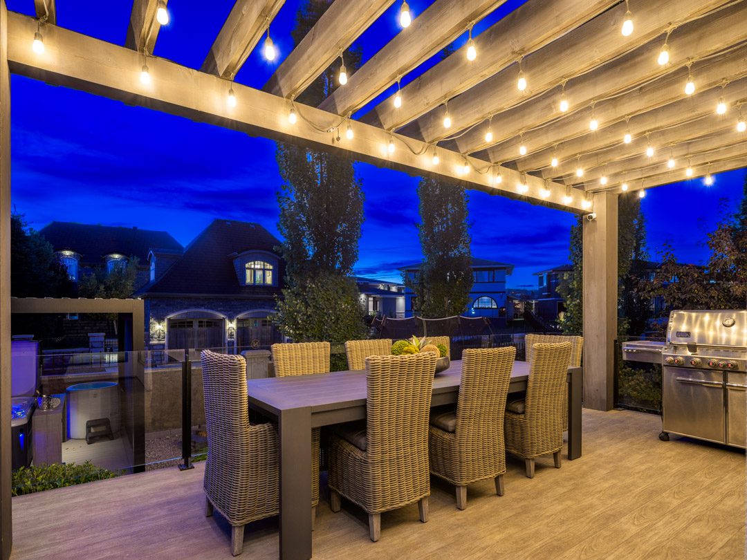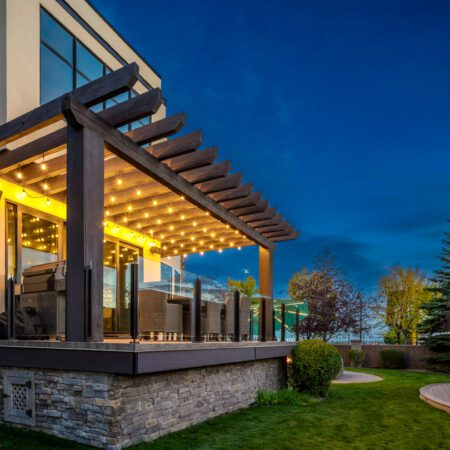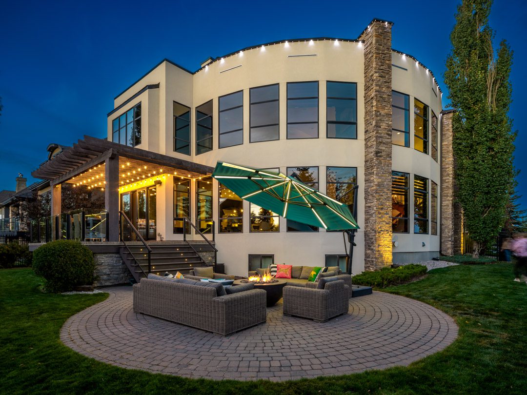 Outside, the property transforms into a private retreat designed for year-round enjoyment. Highlights include multiple patio spaces, a firepit, a covered hot tub area, an outdoor putting green, and an elevated deck with clear glass railing and BBQ—a seamless extension of the home’s indoor living spaces.