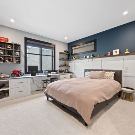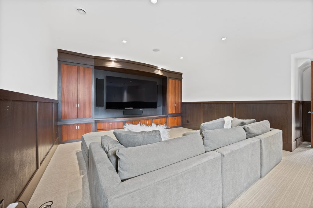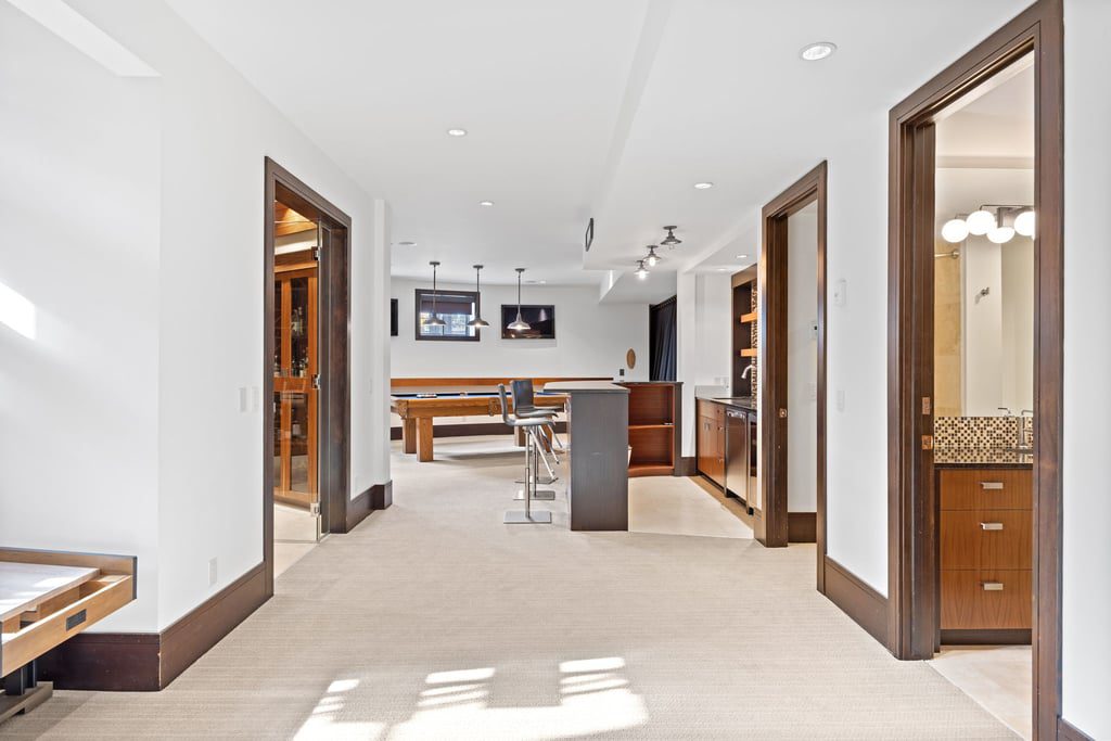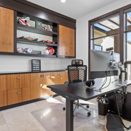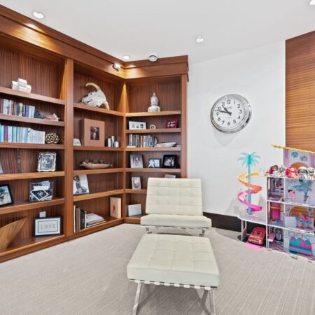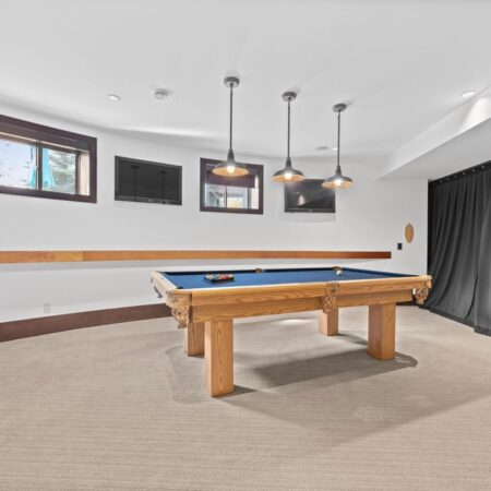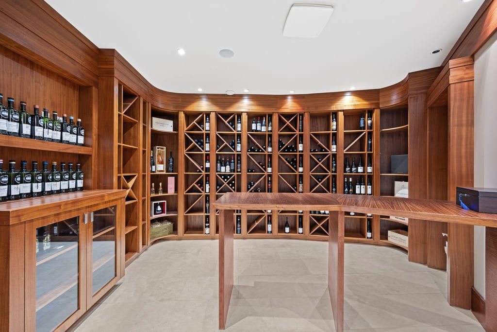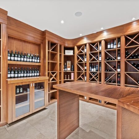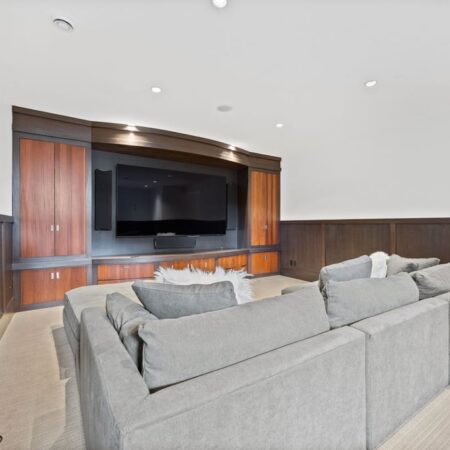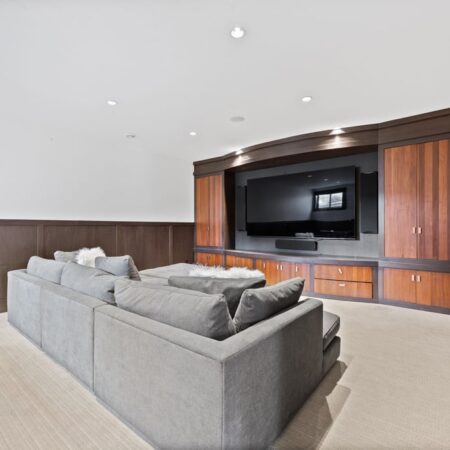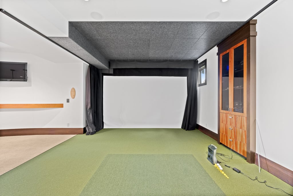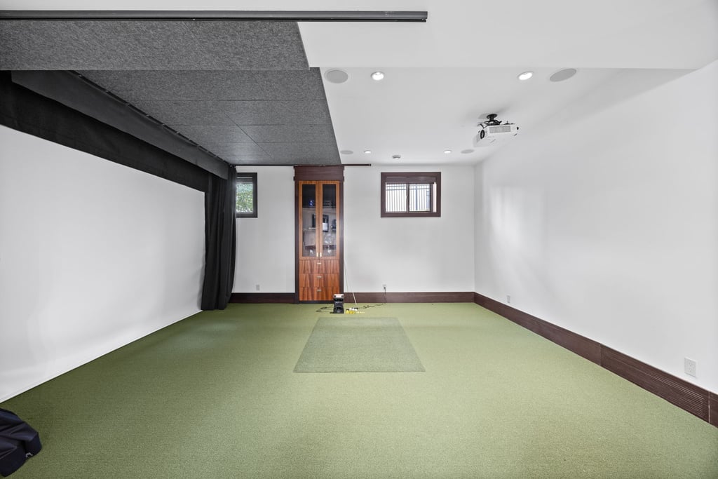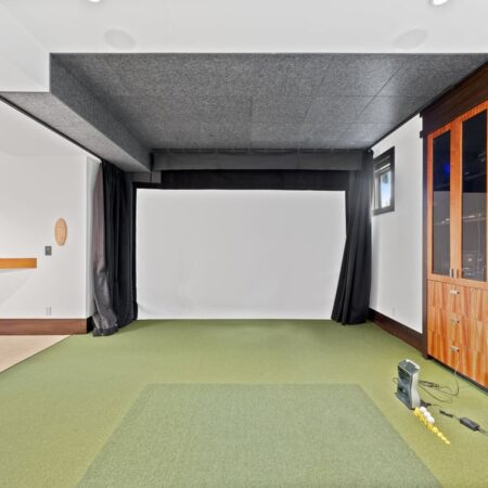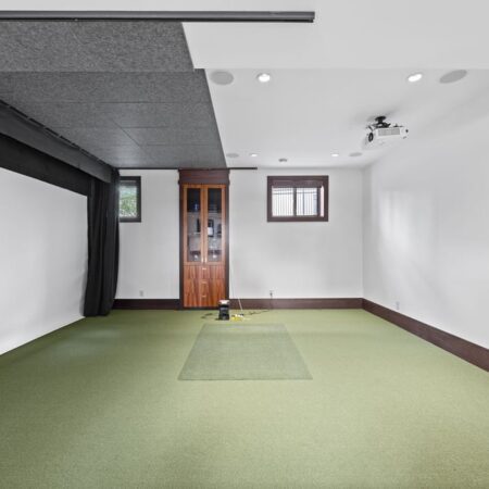 The lower level was designed as the ultimate entertainment and relaxation space, featuring a theatre room, large recreation area, wet bar, temperature-controlled wine cellar, golf simulator, dedicated office, and an additional bedroom—perfect for guests or live-in support.
