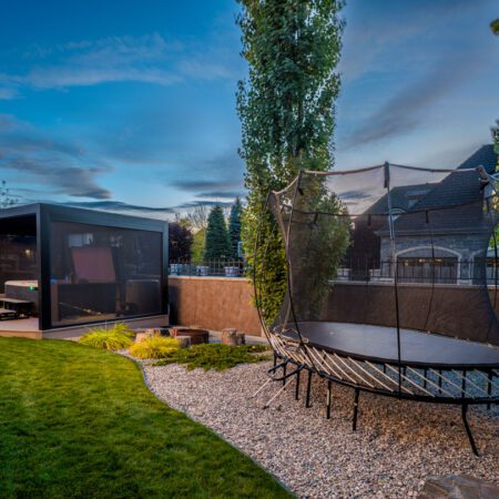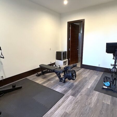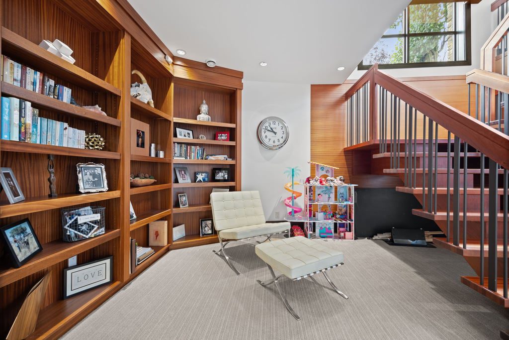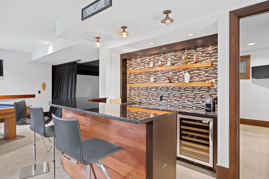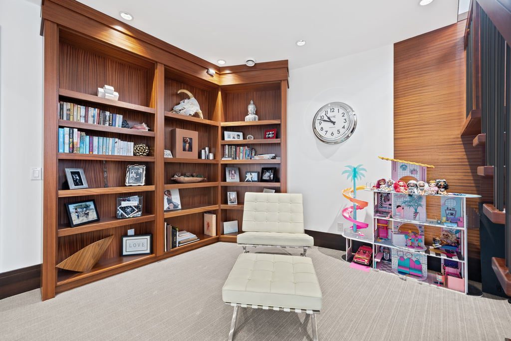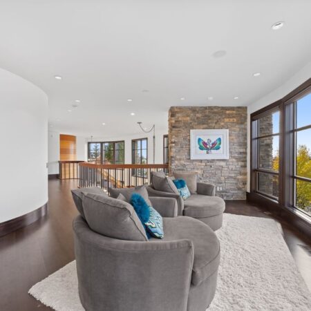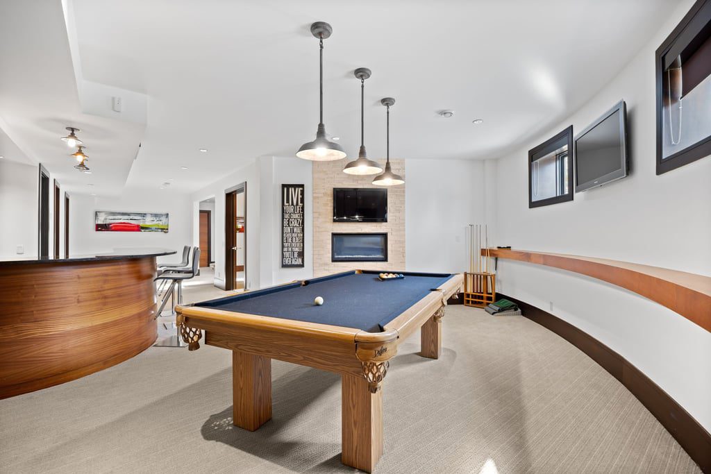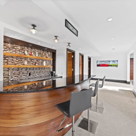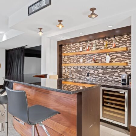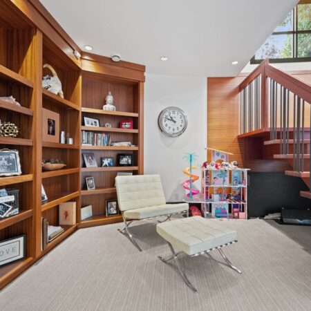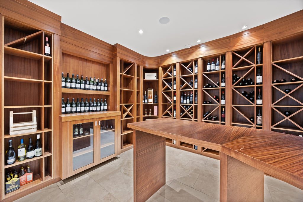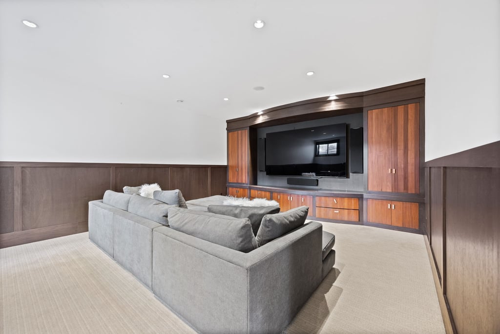 The lower level was designed as the ultimate entertainment and relaxation space, featuring a theatre room, large recreation area, wet bar, temperature-controlled wine cellar, golf simulator, dedicated office, and an additional bedroom—perfect for guests or live-in support.