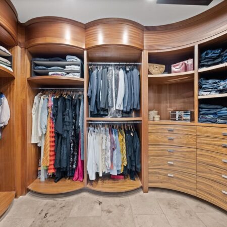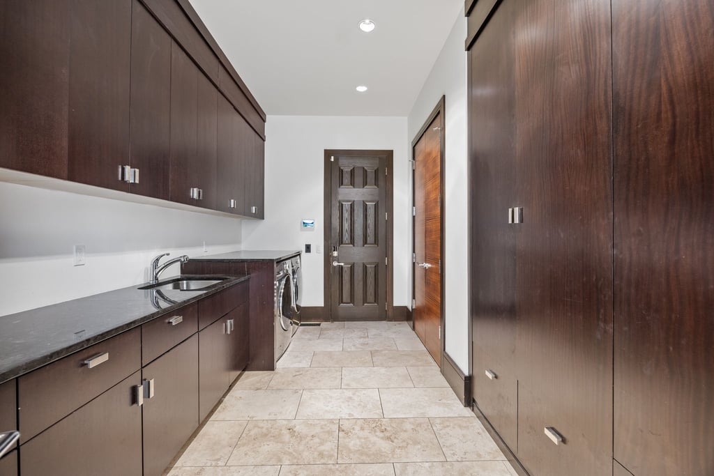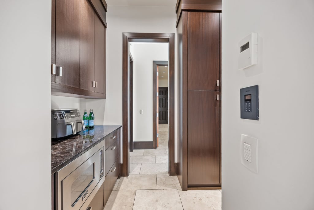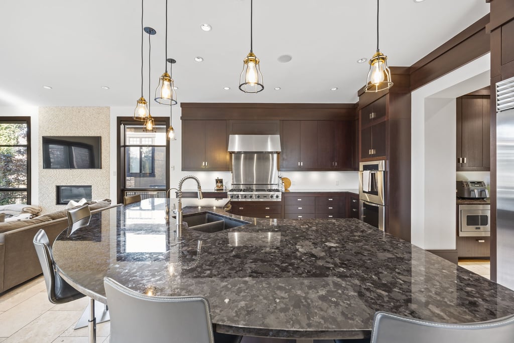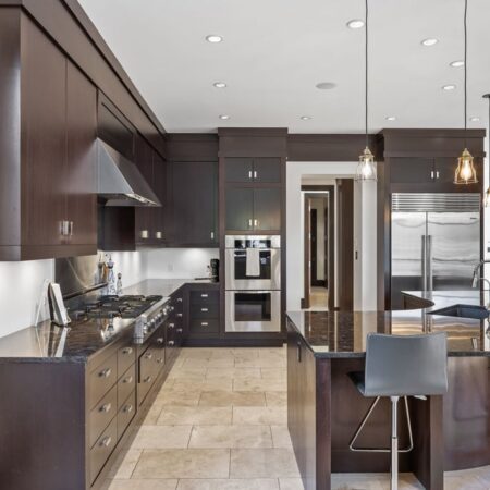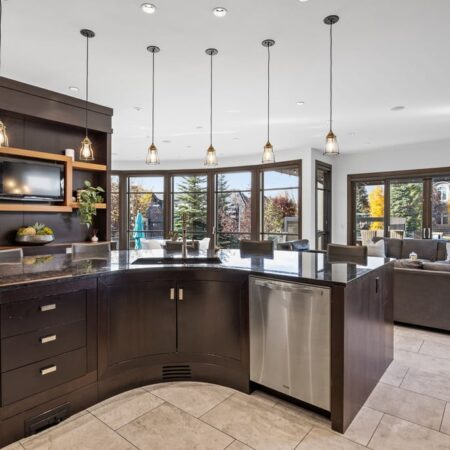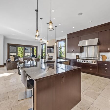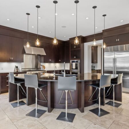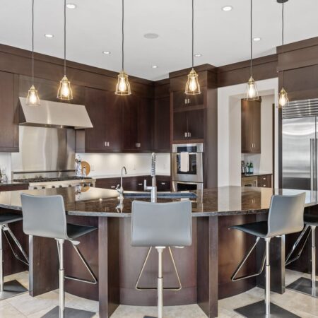 The chef-inspired kitchen is the true heart of the home, combining form and function with a curved granite island, Sub-Zero and Wolf appliances—including a six-burner gas cooktop, double wall ovens, two dishwashers, and an integrated side-by-side refrigerator. A butler’s pantry and wet bar make entertaining effortless, whether hosting a quiet dinner or a lively gathering.