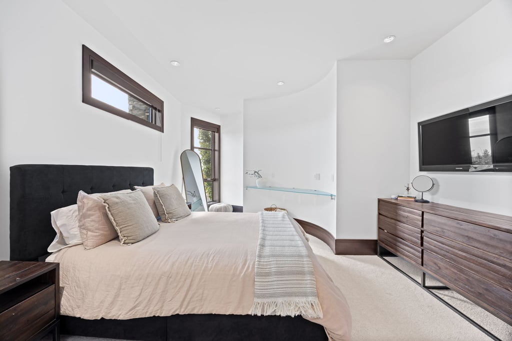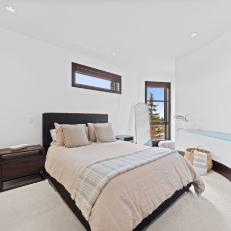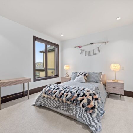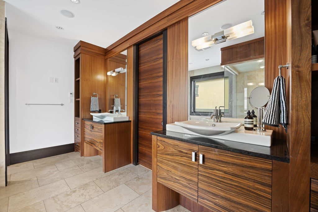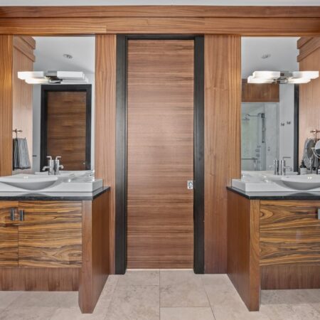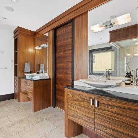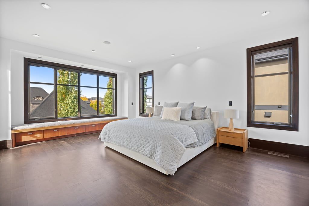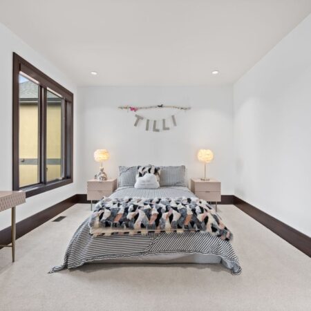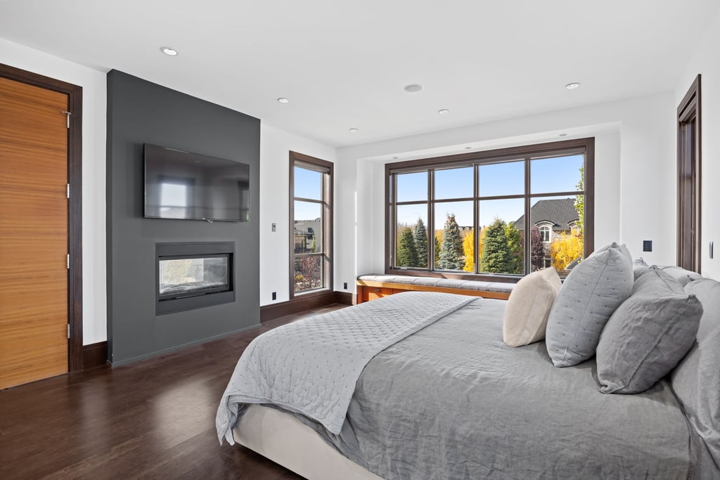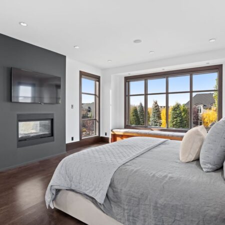 With six bedrooms and five bathrooms, the layout offers exceptional flexibility for family and guests alike. The main floor includes a spacious bedroom with its own ensuite and walk-in closet—ideal for extended family or a private office retreat. Upstairs, each of the additional bedrooms features its own ensuite and walk-in closet, providing privacy and comfort for everyone. The primary suite stands as a serene escape, complete with a two-sided fireplace, 5×5 steam shower, deep thermal tub, and custom pillowed mahogany woodwork—a true statement of luxury.