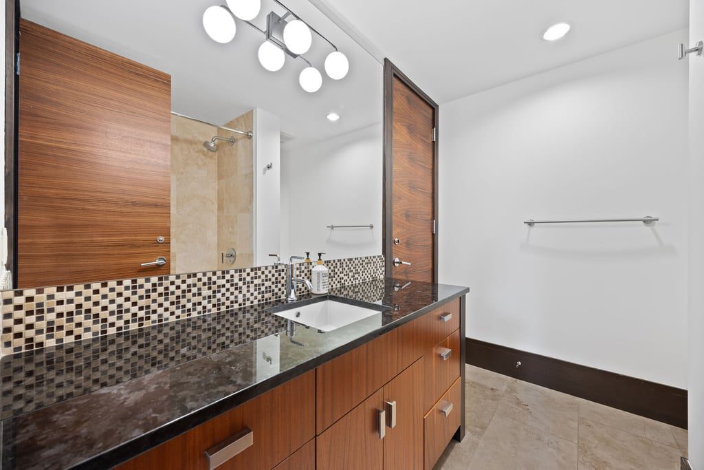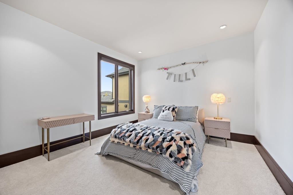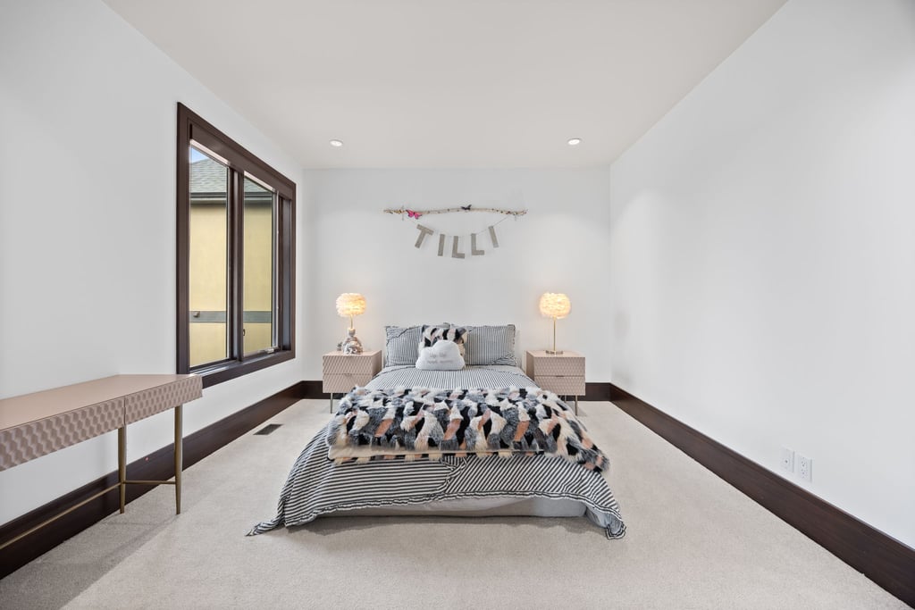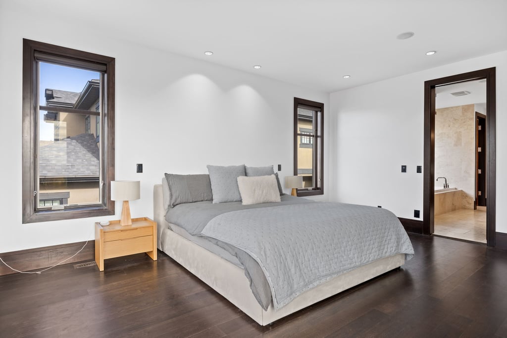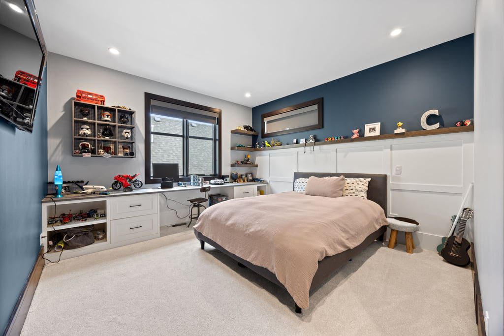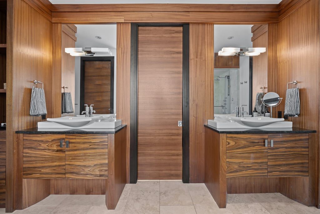 With six bedrooms and five bathrooms, the layout offers exceptional flexibility for family and guests alike. The main floor includes a spacious bedroom with its own ensuite and walk-in closet—ideal for extended family or a private office retreat. Upstairs, each of the additional bedrooms features its own ensuite and walk-in closet, providing privacy and comfort for everyone. The primary suite stands as a serene escape, complete with a two-sided fireplace, 5×5 steam shower, deep thermal tub, and custom pillowed mahogany woodwork—a true statement of luxury.