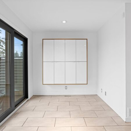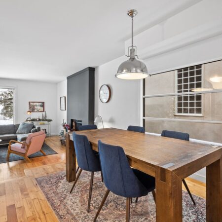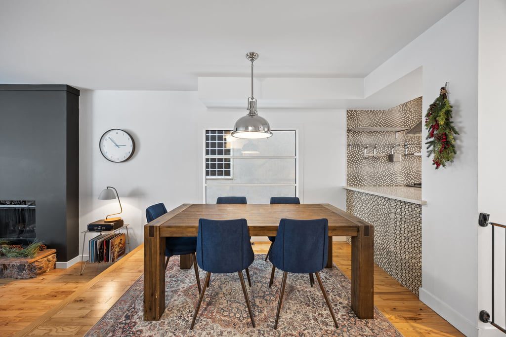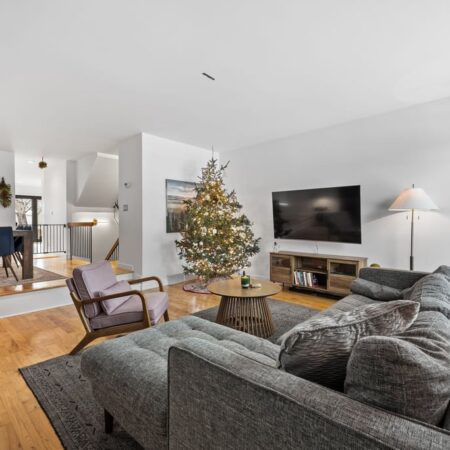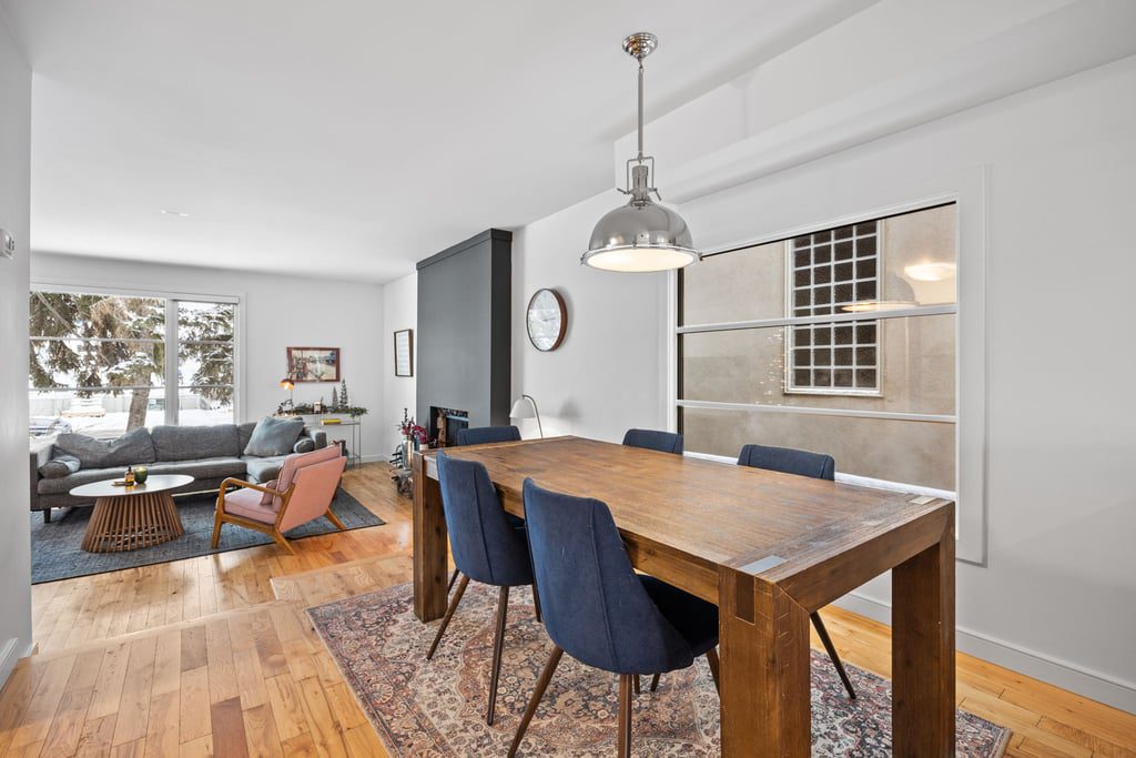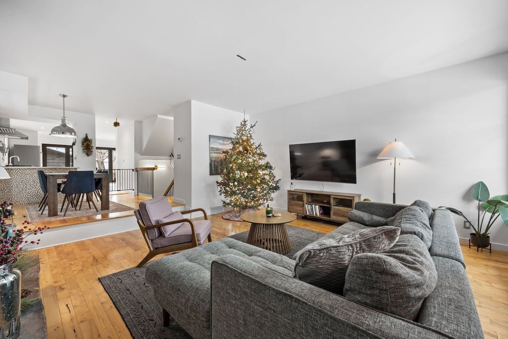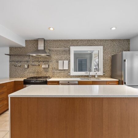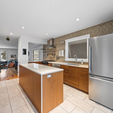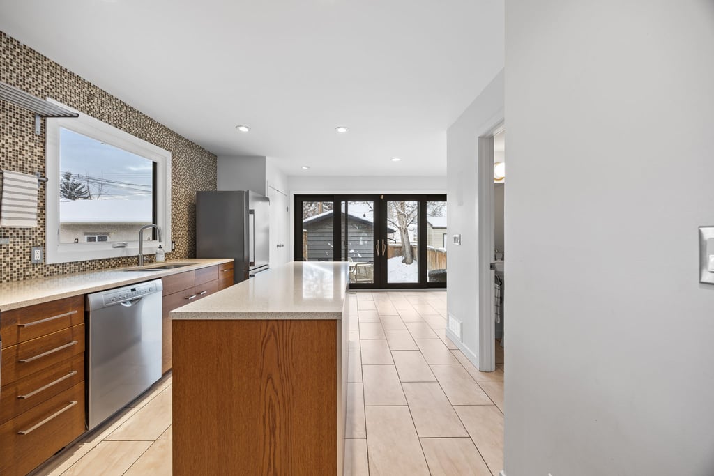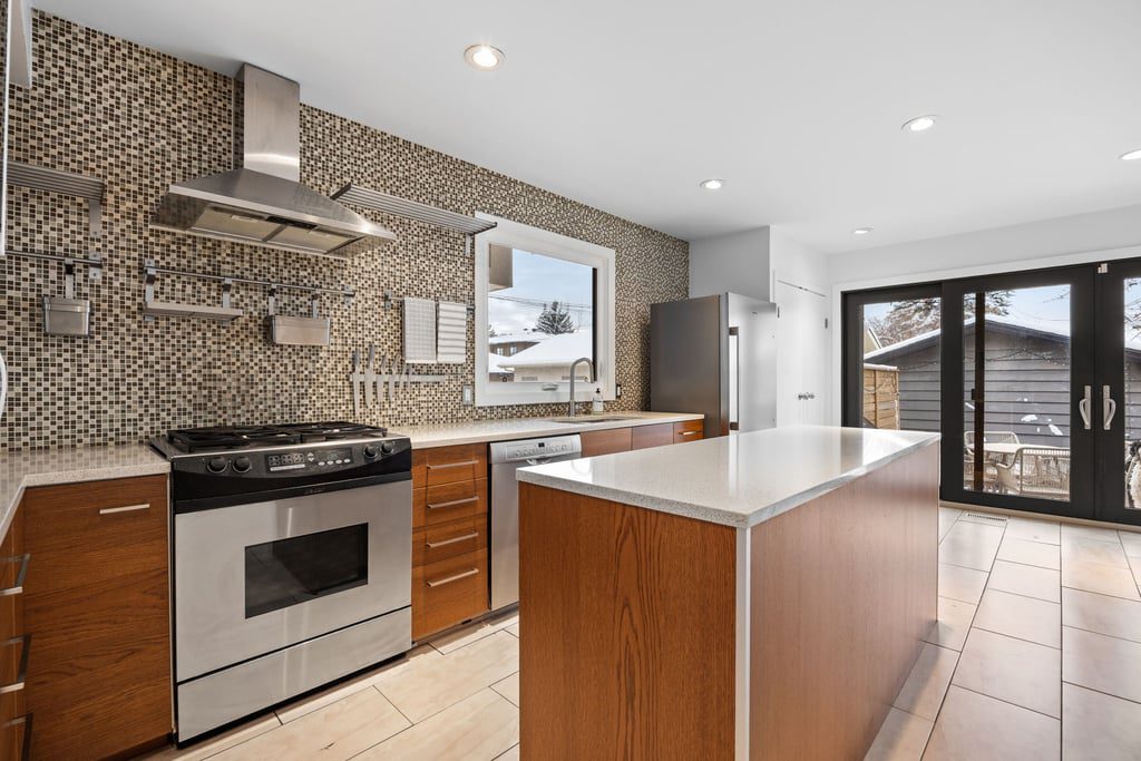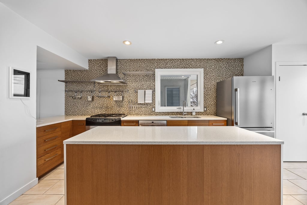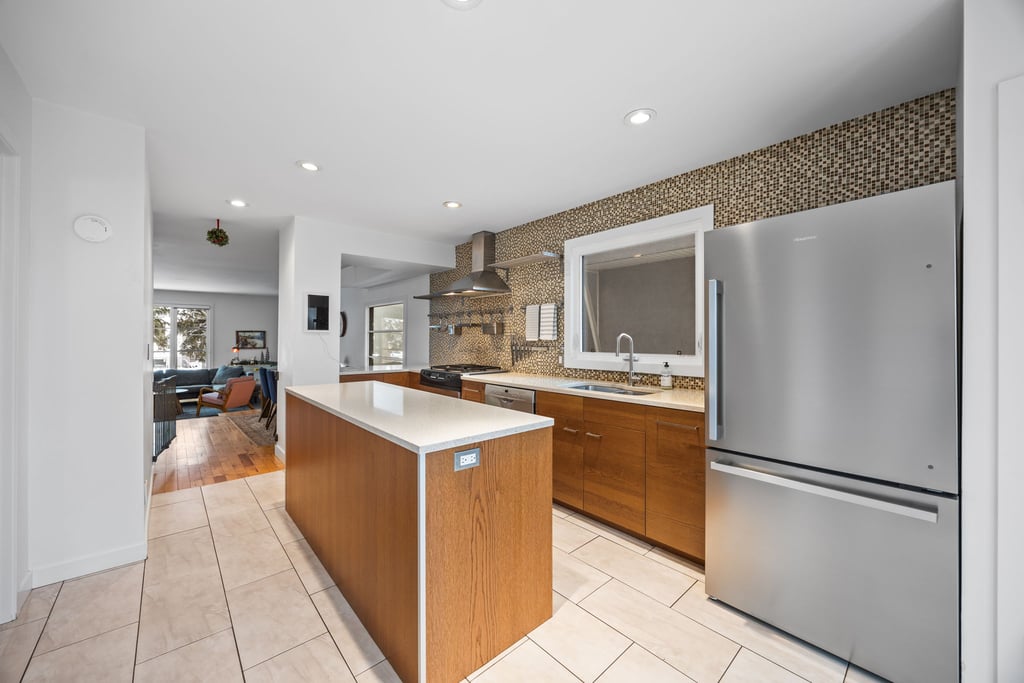 Natural light fills the main floor thanks to large windows and a layout that flows easily into the dining area and refreshed kitchen. Here, sleek contemporary wood cabinetry, quartz countertops, and a trendy tiled backsplash elevate the entire space with a clean, modern look. At the back of the home, magnificent rear glass doors open to a tiered deck, seamlessly connecting indoor and outdoor living.